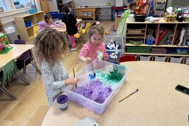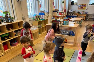 The 3-year-old class meets on Monday and Tuesday mornings from 9:00 to 11:30 a.m. Class size is limited to 16 children with two full time teachers.